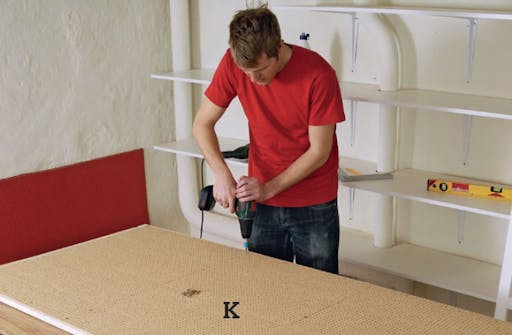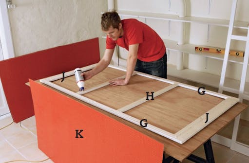 Lägg masonitskivan (K) i det våta limmet och skruva fast den med 4 x 20 mm skruvar på var 20:e cm. Skivan ska placeras 10 mm från ramens underkant så att masoniten inte kommer ner i prof len.