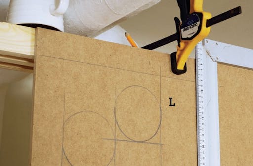 De genomgående rören markeras på skivan (L). Vi spänner fast en skivbit med tvingar på ramen och markerar med lodräta streck var rören hamnar. Rundningarna ritas med hjälp av en kopp eller en burk.