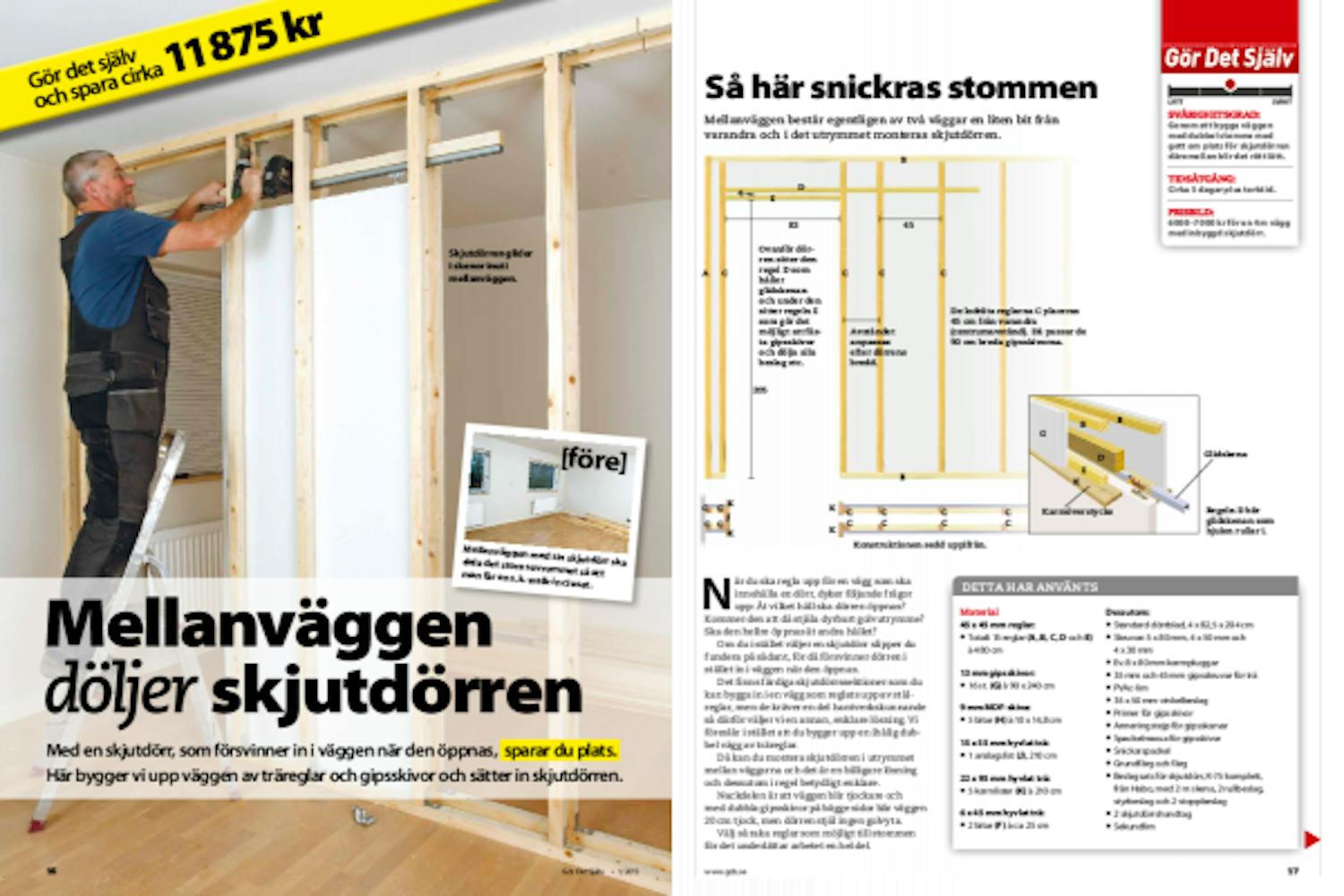 Genom att bygga väggen med dubbel stomme med gott om plats för skjutdörren däremellan blir det rätt lätt.