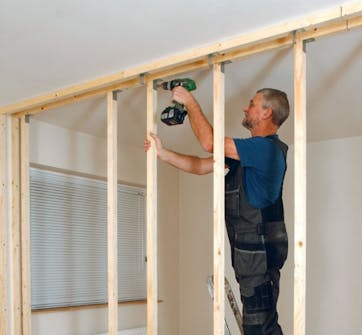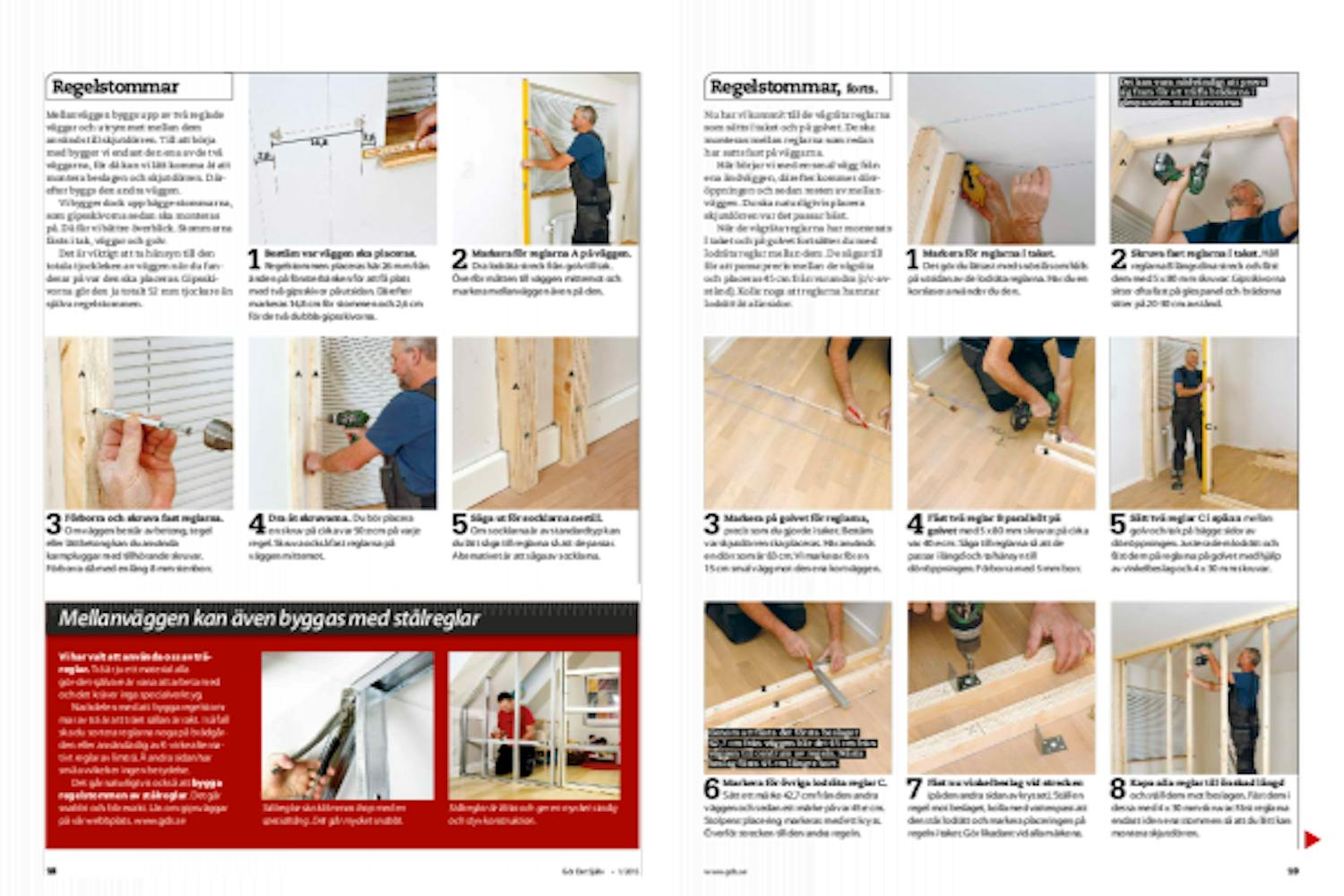 När de vågräta reglarna har monterats i taket och på golvet fortsätter du med lodräta reglar mellan dem. De sågas till för att passa precis mellan de vågräta och placeras 45 cm från varandra (c/c-avstånd). Kolla noga att reglarna hamnar lodrätt åt alla sidor.