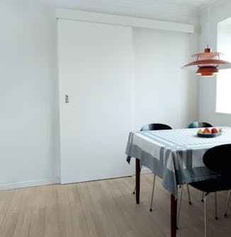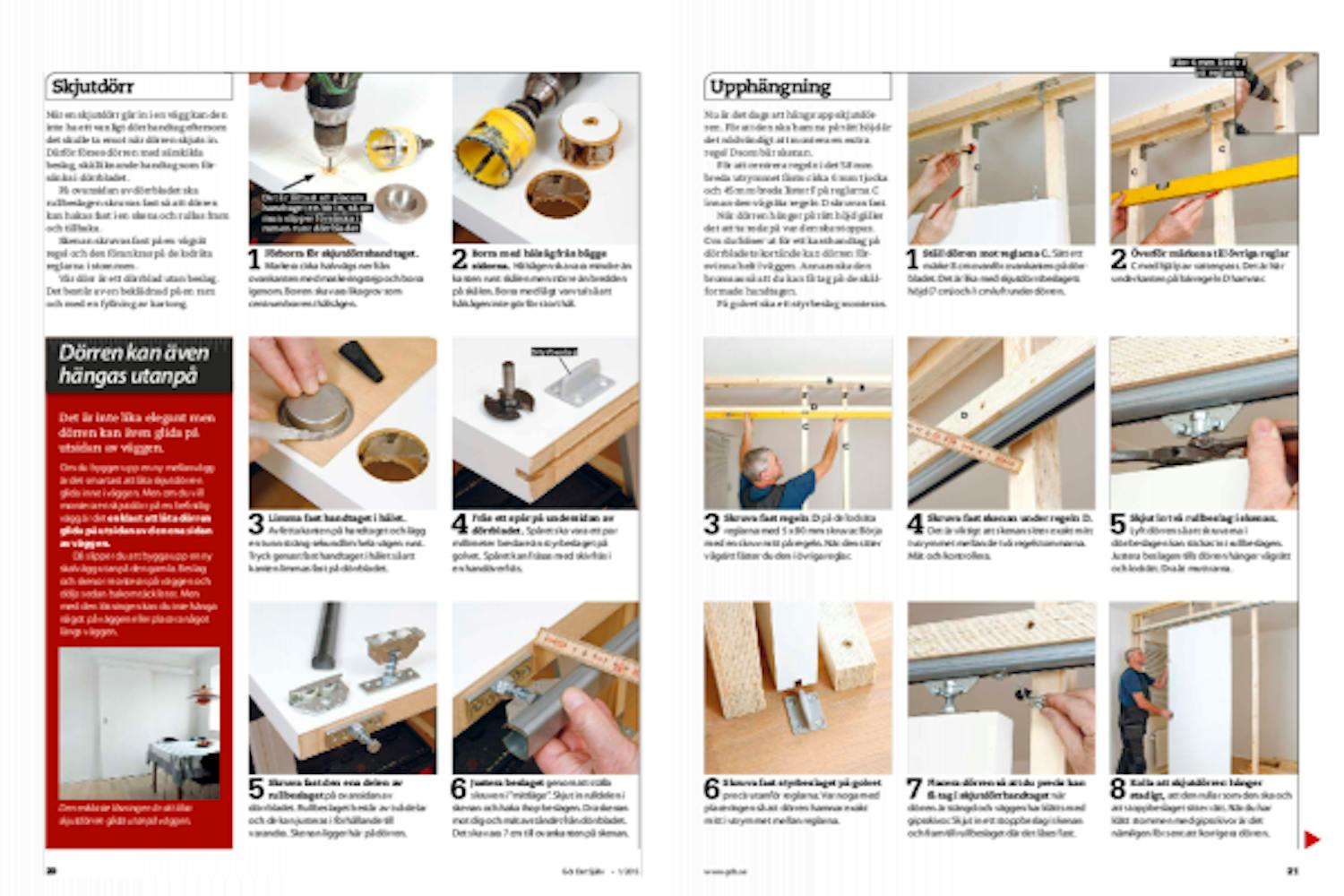 Om du bygger upp en ny mellanvägg är det smartast att låta skjutdörren glida inne i väggen. Men om du vill montera en skjutdörr på en befintlig vägg är det enklast att låta dörren glida på utsidan av den ena sidan av väggen. Då slipper du att bygga upp en ny skalvägg utanpå den gamla. Beslag och skenor monteras på väggen och döljs sedan bakom täcklister. Men med den lösningen kan du inte hänga något på väggen eller placera något längs väggen.