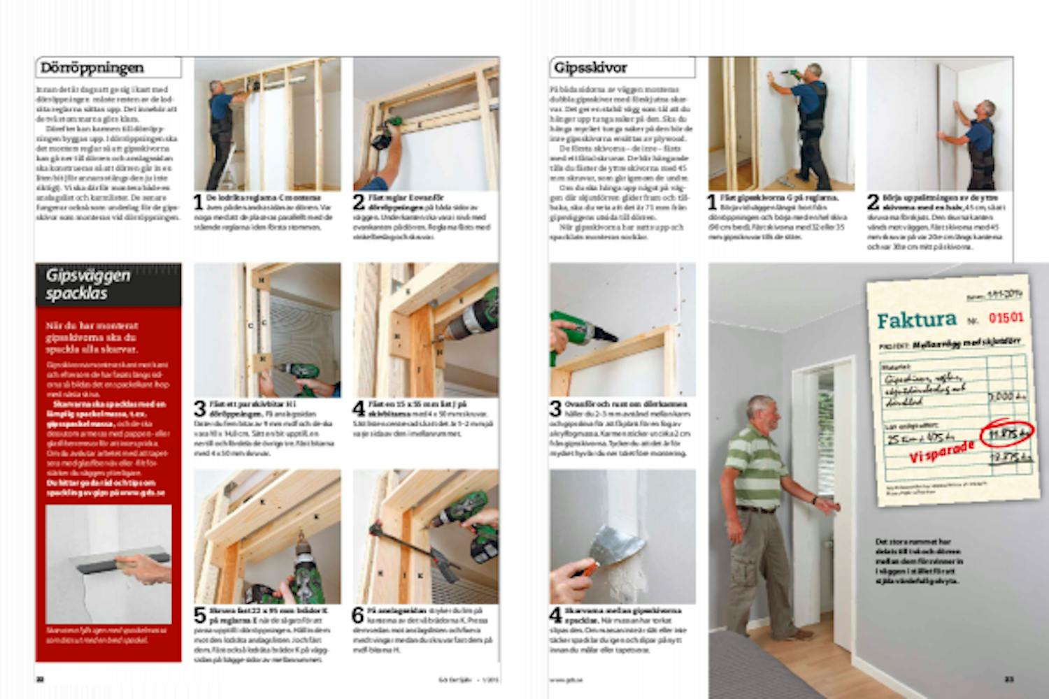 På båda sidorna av väggen monteras dubbla gipsskivor med förskjutna skarvar. Det ger en stabil vägg som tål att du hänger upp tunga saker på den. Ska du hänga mycket tunga saker på den bör de inre gipsskivorna ersättas av plywood.