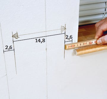 Bestäm var väggen ska placeras. Regelstommen placeras här 26 mm från änden på fönsterbänken för att få plats med två gipsskivor på utsidan. Därefter markeras 14,8 cm för stommen och 2,6 cm för de två dubbla gipsskivorna.