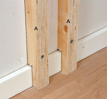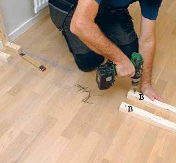 Fäst två reglar B parallellt på golvet med 5 x 80 mm skruvar på cirka var 40:e cm. Såga till reglarna så att de passar i längd och ta hänsyn till dörröppningen. Förborra med 5 mm borr.