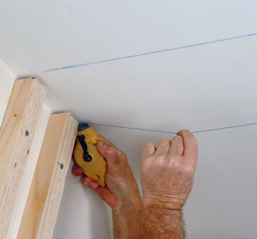 Markera för reglarna i taket. Det gör du lättast med snörslå som hålls på utsidan av de lodräta reglarna. Har du en korslaser använder du den.