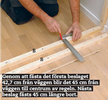 Markera för övriga lodräta reglar C. Sätt ett märke 42,7 cm från den andra väggen och sedan ett märke på var 45:e cm. Stolpens placering markeras med ett kryss. Överför strecken till den andra regeln.