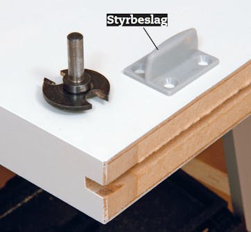 Fräs ett spår på undersidan av dörrbladet. Spåret ska vara ett par millimeter bredare än styrbeslaget på golvet. Spåret kan fräsas med skivfräs i en handöverfräs.