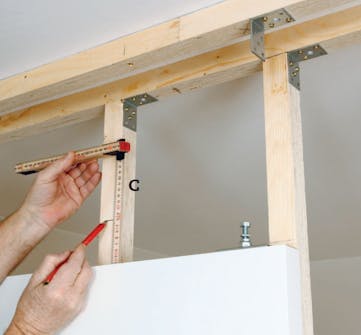Fäst nu vinkelbeslag vid strecken (på den andra sidan av krysset). Ställ en regel mot beslaget, kolla med vattenpass att den står lodrätt och markera placeringen på regeln i taket. Gör likadant vid alla märkena.