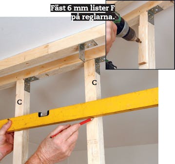 Skruva fast reglarna i taket. Håll reglarna B längs dina streck och fäst dem med 5 x 80 mm skruvar. Gipsskivorna sitter ofta fast på glespanel och brädorna sitter på 20-30 cm avstånd.