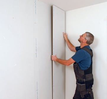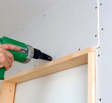 Fäst gipsskivorna G på reglarna. Börja vid väggen längst bort från dörröppningen och börja med en hel skiva (90 cm bred). Fäst skivorna med 32 eller 35 mm gipsskruvar tills de sitter.