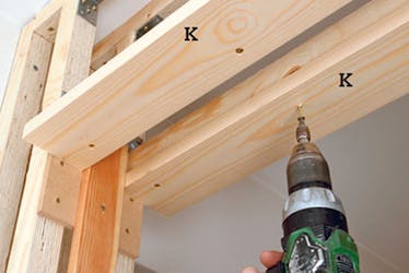 Skruva fast 22 x 95 mm brädor K på reglarna E när de sågats för att passa upptill i dörröppningen. Håll in dem mot den lodräta anslagslisten J och fäst dem. Fäst också lodräta brädor K på väggsidan på bägge sidor av mellanrummet.