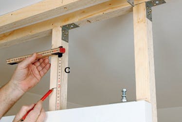 Fäst reglar E ovanför dörröppningen på båda sidor av väggen. Underkanten ska vara i nivå med ovankanten på dörren. Reglarna fästs med vinkelbeslag och skruvar.