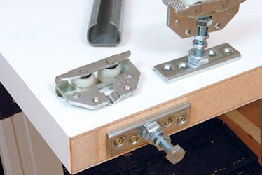 På ovansidan av dörrbladet ska rullbeslagen skruvas fast så att dörren kan hakas fast i en skena och rullas fram och tillbaka.