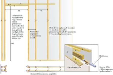 Mellanväggen byggs upp av två reglade väggar och utrymmet mellan dem används till skjutdörren. Till att börja med bygger vi endast den ena av de två väggarna, för då kan vi lätt komma åt att montera beslagen och skjutdörren. Därefter byggs den andra väggen.