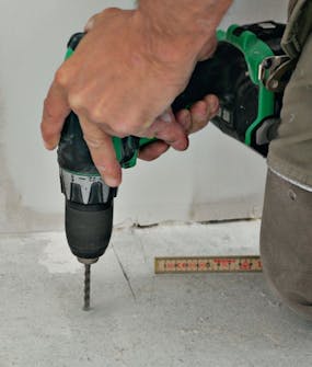 Borra hål på var 60- 80:e cm i montageskenan för de skruvar du ska fästa den med på golvet. Försänk hålen så att skruvarna inte sitter i vägen när bottenskenan klickas fast.