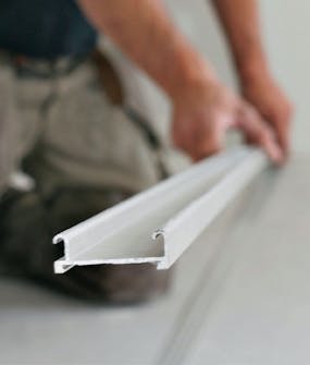 Även om du endast har monterat en toppskena så behövs det två golvskenor. Först ska du fästa en montageskena på golvet och på den klickar du fast bottenskenan. Då döljs skruvarna.