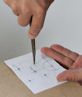 Träet mot kanten tas bort med ett vasst stämjärn. Hålet för låsskruven borras med 6 mm borr och hålen för skruvarna med 2,5 mm borr.