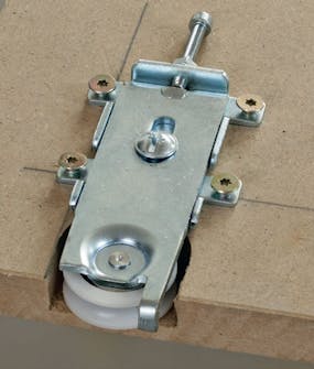 De tre dörrarna rullar nu på kanten av bottenskenan och upptill styrs de av topphjulen i toppskenan. Det kan vara nödvändigt med en finjustering av höjden och den görs med justeringsskruven till bottenhjulen, som kan höjas och sänkas några millimeter.