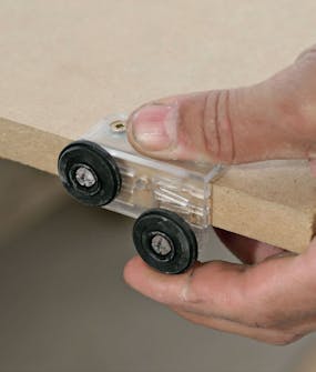 Kolla att det ena hjulet är fjäderbelastat. När det trycks in kan du sticka upp beslaget i spåret i toppskenan. När hjulet pressas ut styr det dörren när den dras.