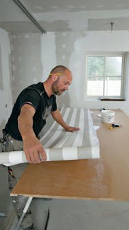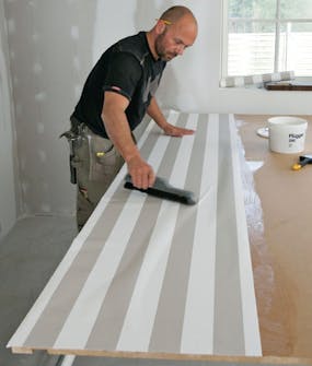 Dags att tapetsera. Våderna ska vara lite för långa och skärs av senare. Var noga med att mönstret sitter som det ska. Sträck tapeten medan du sätter upp den.