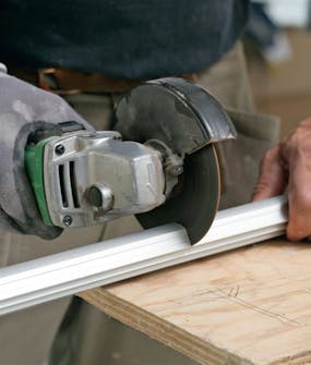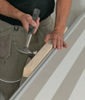 Nu kan du trycka till så de två skenorna klickas ihop. Går det trögt kan du knacka ner montageskenan med hammare och kloss. Kolla också att det inte ligger något i vägen, smuts eller borrdamm.