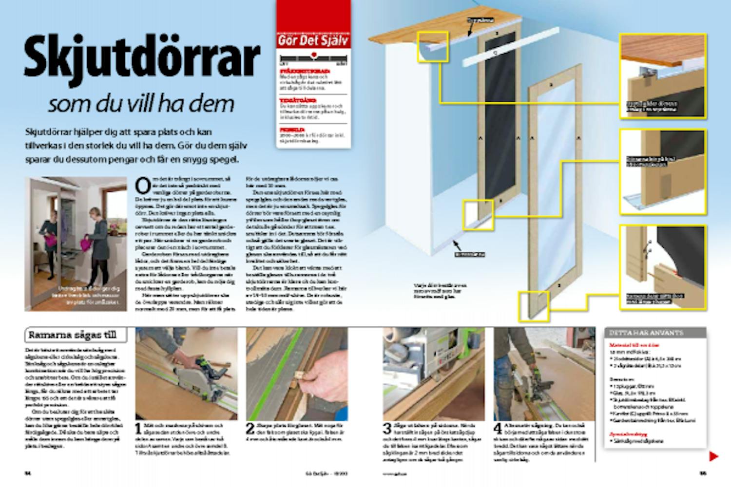 Det finns två slags skjutdörrar: de topp-hängda med hjul upptill och de som har hjul nertill. Vi har här valt dörrar som rullar i en skena på golvet.