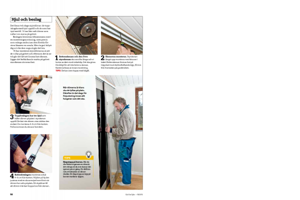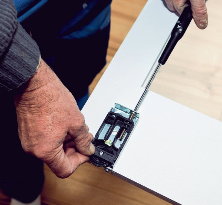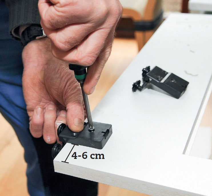 Bottenbeslagen monteras också 4-6 cm från kanten. Höjden på hjulen justeras med en skruvmejsel men först när dörren har satts på plats. Ett skydd ser till att dörren inte kan hoppa loss från skenan.