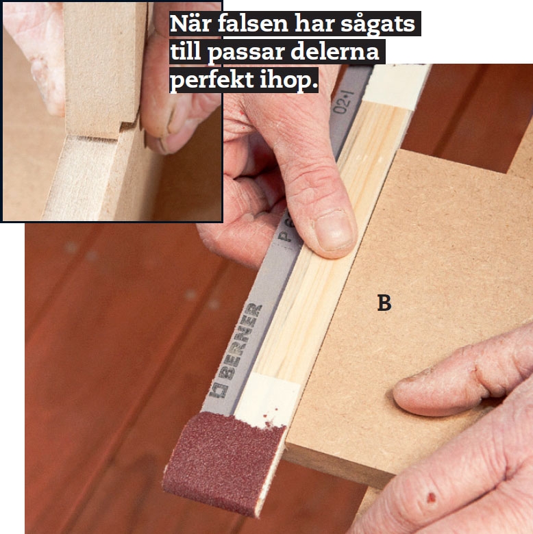 Kolla noga! Kolla flera gånger att sågen är korrekt inställd. En smula glapp eller en liten miss kan elimineras med hjälp av slippapper på en tunn list. Fäst slippapperet med dubbelhäftande tejp.