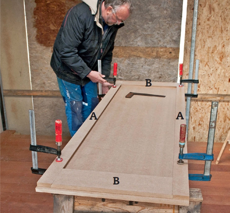 Mät och markera på skivan och såga sedan ut den övre och undre delen av ramen. Varje ram består av två sidor A samt en undre och övre ramdel B. Till två skjutdörrar behövs alltså åtta delar.