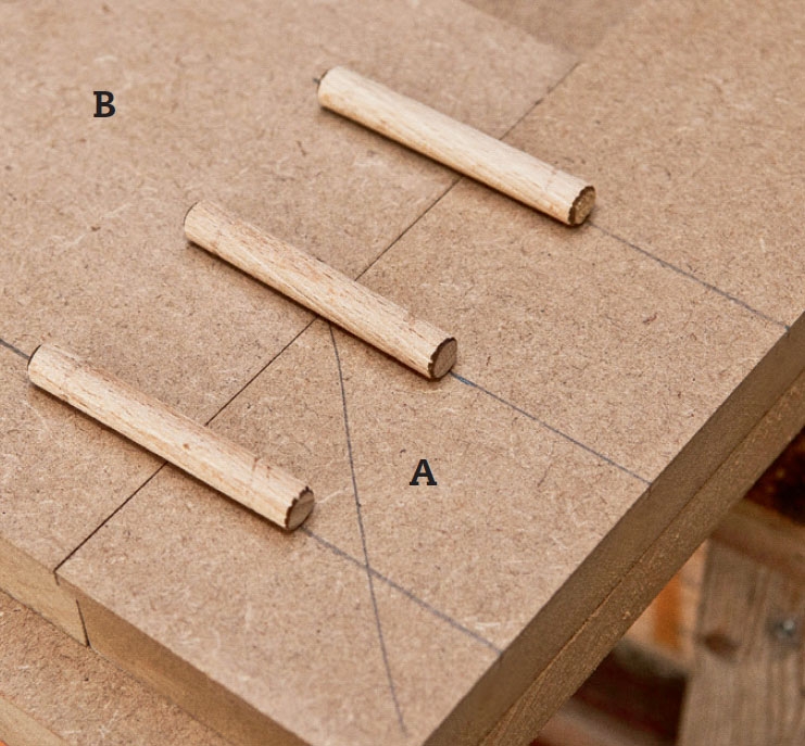 Ihopsättning med pluggar. Markera var du ska borra. Använd en 10 mm borr och borra vinkelrätt in från kanten på tre ställen, genom sidan och in i nästa del.