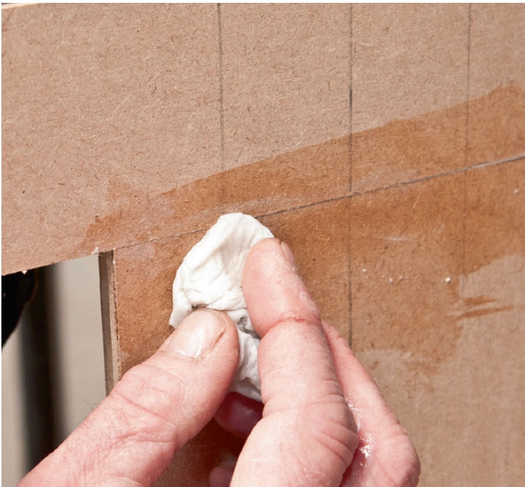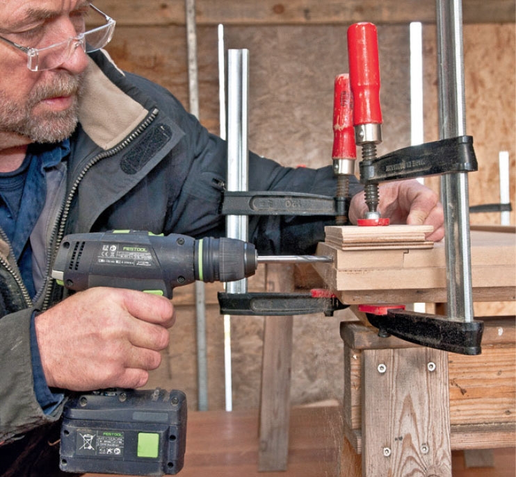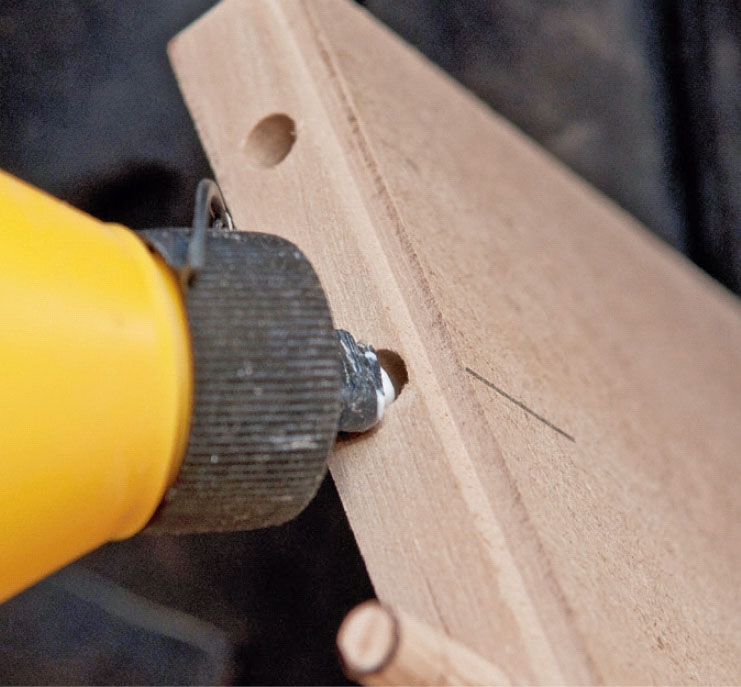 Borra utan att spräcka träet. Be en medhjälpare se efter att du borrar vågrätt. Skruvtvingarna håller ramdelarna på plats och hindrar mdf-bitarna att förskjutas. Låt borren arbeta tills hålet är rent och pluggen får plats.