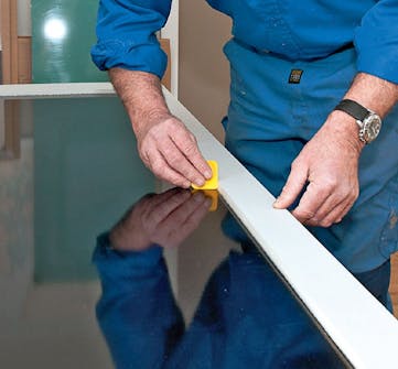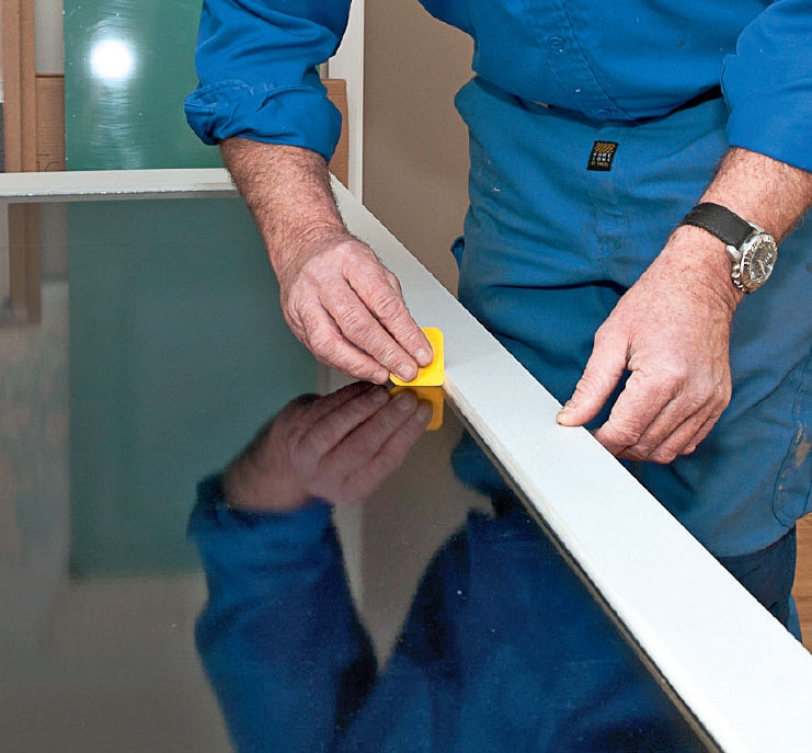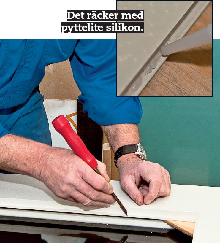 Falsen rensas med t.ex. ett stämjärn och dammsugs sedan. Lägg en tunn och fin sträng silikon längst in i falsen. Då minskas risken att det pressas ut silikon på glaset.