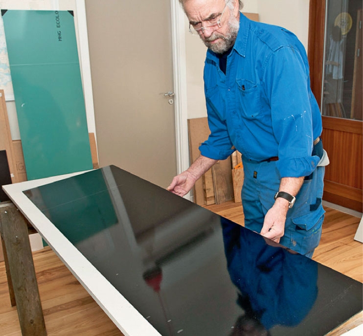 Lägg glaset på plats. Både spegeln och det svarta glaset är 2-3 mm mindre än falsmåtten vågrätt och lodrätt. Lägg ner glaset försiktigt och stötta det eventuellt underifrån.