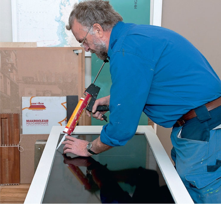 Silikonet förseglar glaset. Den första strängen silikon håller fast glaset. Nästa sträng (på baksidan) förseglar så att glaset inte lossnar. Lägg en sträng i falsen.