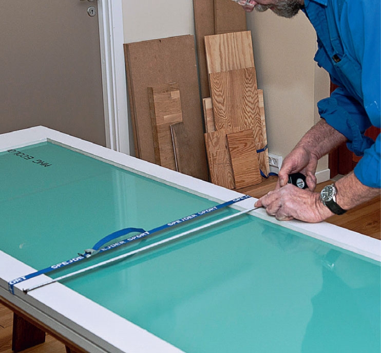 Provmontering av ramen. Lägg de fyra ramdelarna på ett plant och fast underlag. Kolla att vinklarna är räta och att fogarna sluter tätt..