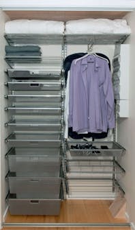 Det är hur lätt som helst att sätta delarna i inredningen på plats även om det kan kräva en viss tillpassning. Det svåraste är att bestämma sig för hur inredningen ska se ut. Hyllsystemet har en bredd på 60 cm och eftersom vår garderob blir 129 cm får det plats två moduler vid sidan av varandra. Med fasta trådkorgar kostar inredningen cirka 1600 kr. Den lyxigare varianten med utdragbara lådor är något dyrare, så det kan vara klokt att kombinera fasta och utdragbara lådor och korgar. Du kan också fästa några hyllor med beslag på garderobsväggen.