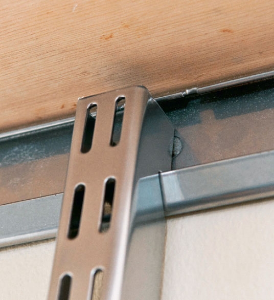 Toppbeslagen har tre hjul som håller dörren på plats i styrskenan upptill. De bär inte dörren utan stöttar den endast. De monteras 4-6 cm från kanten. Förborra innan du skruvar fast dem.