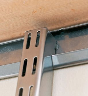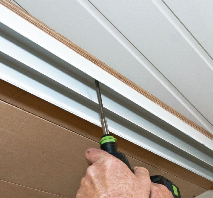 Skenorna monteras. Styrskenan längst upp monteras med skruvar i taket. Bottenskenan limmas fast på trägolvet med dubbelhäftande tejp, 30 mm från framsidan på garderoben.