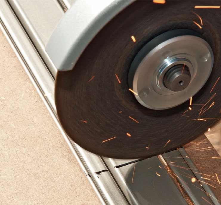 Bottenskenan och den övre styrskenan ska vara lika långa och vi kortar av dem med vinkelslip. Det ska göras försiktigt för att inte bränna skenan. Kanterna fasas av innan montering.