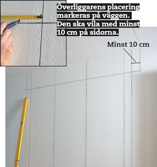 Spänn fast överliggaren på brädorna så att den hamnar plant med väggen. Ta bort lim som pressas ut ur fogarna, för det är svårt att få bort limmet när det har härdat.