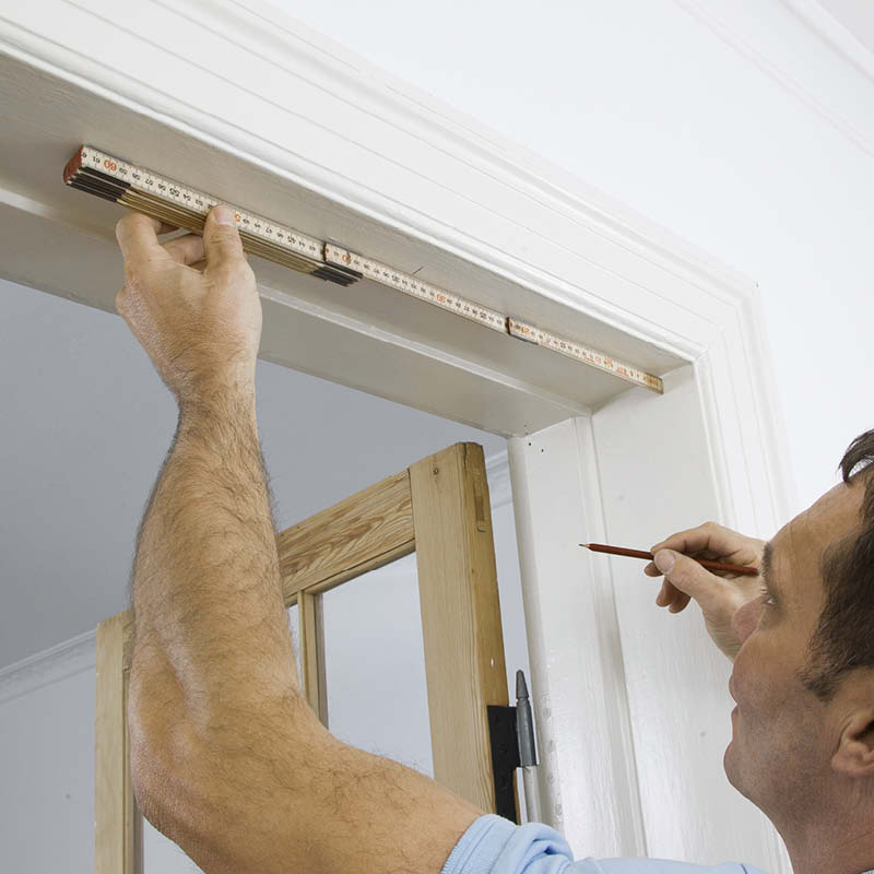 Mät dörröppningens bredd uppe och nere. Mät från ena sidan och sätt ett streck vid valfritt mått. Mät sedan mot strecket från den andra sidan. När de två måtten läggs ihop har du den exakta bredden.