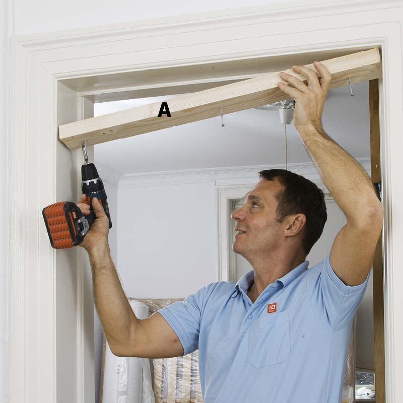 Skruva fast korta reglar (A) i den övre karmen och tröskeln efter dina markeringar. Använd 4 x 70 mm skruv – sätt 3 st i varje regel.