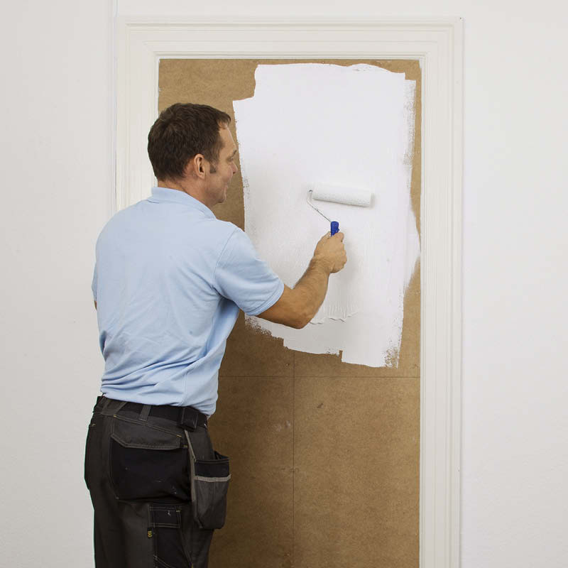 Fäst en golvlist på båda sidor om dörren – med dyckert eller stift var 20:e cm. Här använder vi en färdigmålad list. På så sätt sparar vi in det första lagret färg. Dyckerten spacklas över före den sista strykningen.