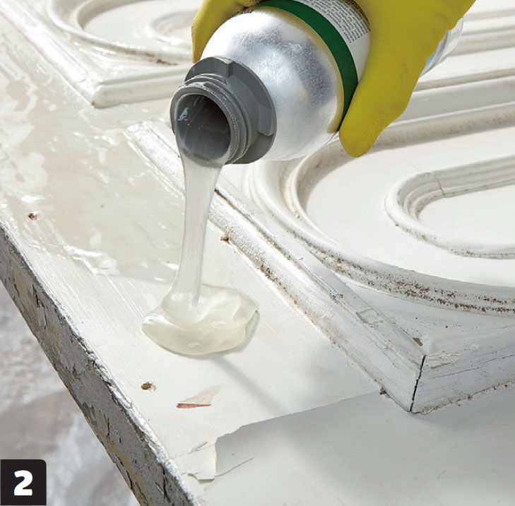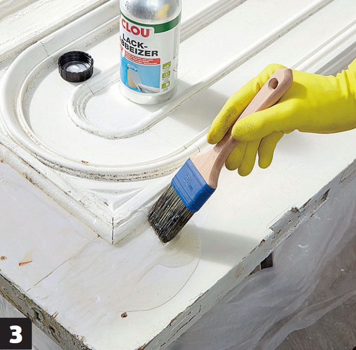 Fördela lackborttagningen i ett tjockt lager med en pensel. Det är viktigt att komma in i alla fogar och skarvar, eftersom det är där det är svårast att senare komma åt med en skrapa eller excenterslip.