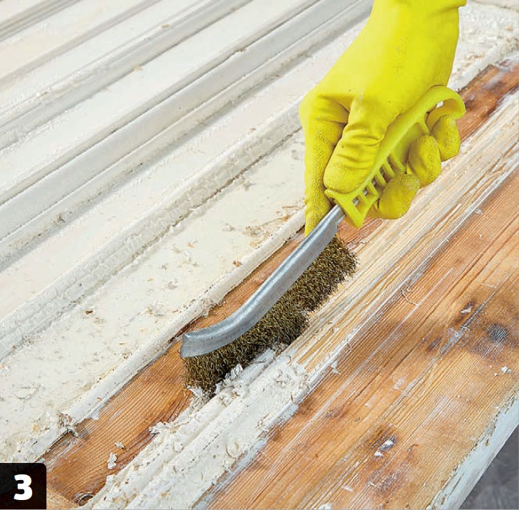 Borsta profilerna noggrant med en mässingsborste. Borsten har fördelen att den formar sig efter profilerna i motsats till skrapor och spacklar.