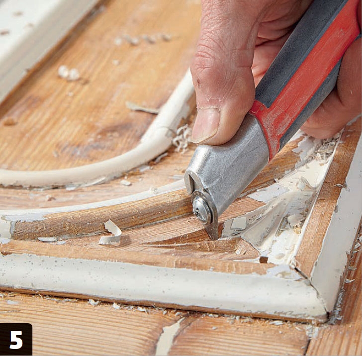 Det kan vara en bra idé att ta ett steg tillbaka och få överblick över projektet. De stora ytorna går förhållandevis snabbt att skrapa och de rester som kan sitta kvar kan enkelt slipas med en excenterslip. Profilerna tar däremot lång tid, varför det kan behövas en paus eller två när man får mjölksyra i armarna.