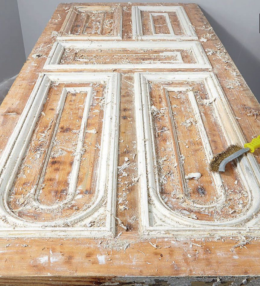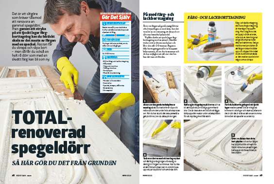 Eftersom alla spegeldörrar inte ser likadana ut är det svårt att peka på exakt vilka verktyg du ska använda. I vårt fall har vi använt både en spackel på de stora ytorna och en stålborste till profilerna, medan vi har använt en panelskrapa och en skrapa med smalt blad till de många speglarna. Och eftersom just färgen i speglarna kan vara svår att få bukt med använde vi också en varmluftspistol för att få färgen att släppa från träet.