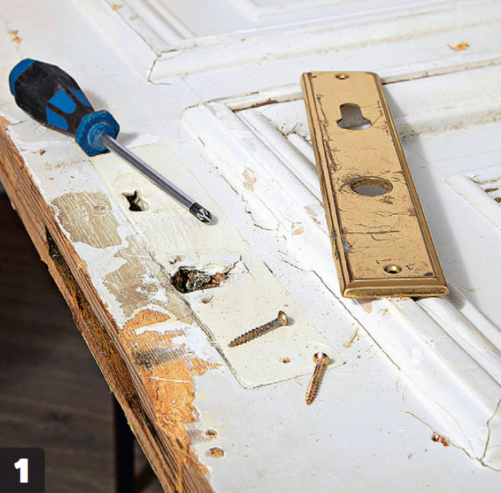Skruva av den gamla täckskylten av mässing så att du inte behöver slipa och måla runt om den under hela arbetsprocessen. När du har strukit det sista penseldraget på dörren, kan du sätta på den igen.