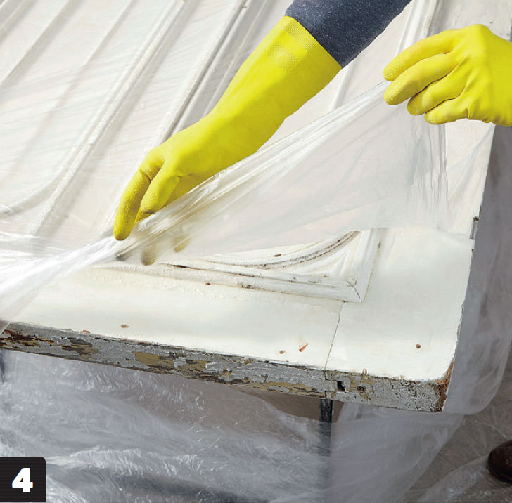 Täck över dörren med ett tunt lager plast och låt färgborttagningen arbeta sig ordentligt in i färgen i 2-3 timmar. Har du inte en stor bit tunn plast, kan du också klippa upp ett par sopsäckar och använda dem.