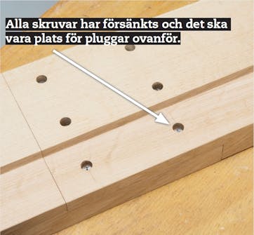 Anpassa fogen. Borra först 10 mm plugghål med träborr. Borra sedan vidare med smalare borr som förborrning för skruvarna. Sätt ihop delarna med syrafasta skruvar och fräs den långa falsen.